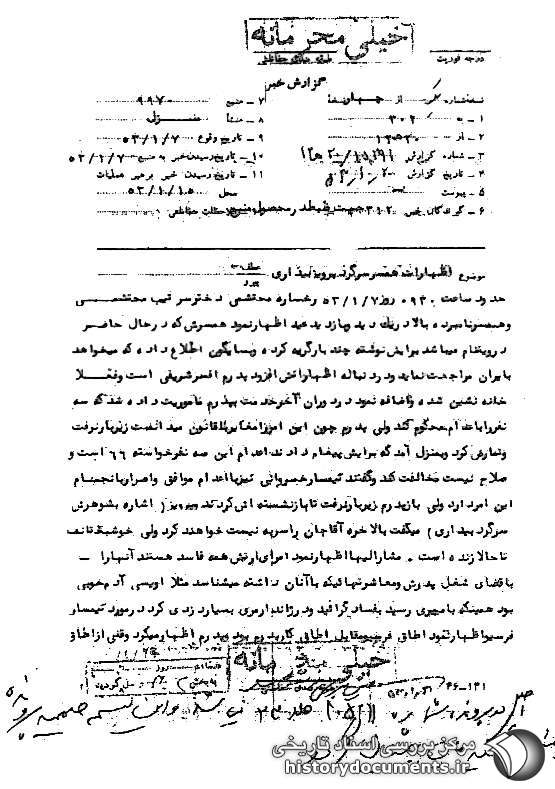اصل در پرونده شماره 105211 جلد 23 مىباشد و این نسخه ضمیمه پرونده تیمسار ارتشبد مینباشیان گردد.