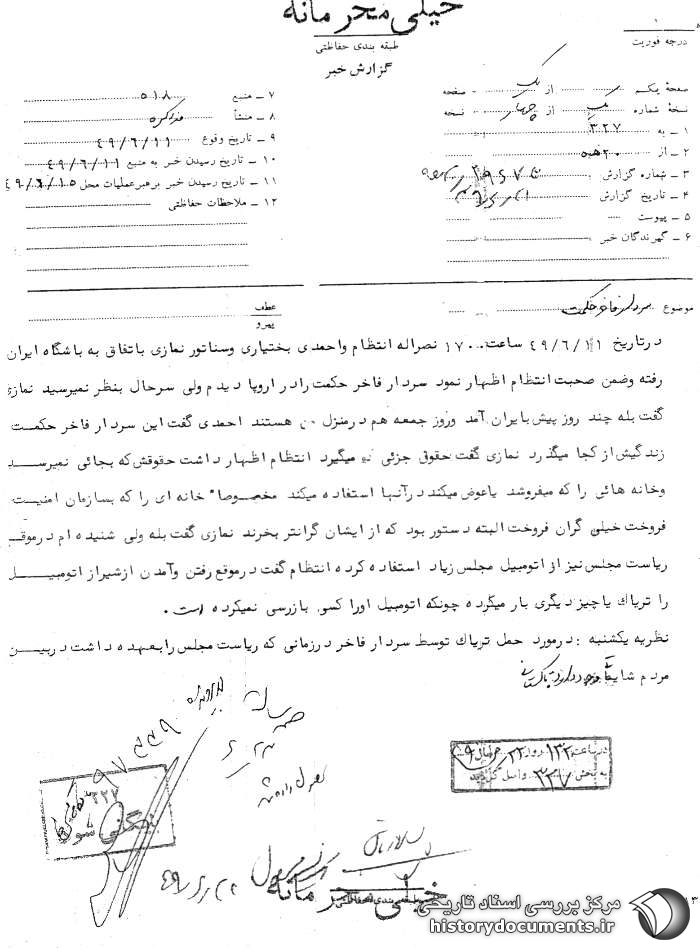 در تاریخ 11 /6 /49 ساعت 1700 نصراله انتظام و احمدی بختیاری و سناتور نمازی به اتفاق به باشگاه ایران رفته و ضمن صحبت انتظام اظهار نمود سردار فاخر حکمت را در اروپا دیدم ولی سر حال به نظر نمیرسید نمازی گفت بله چند روز پیش به ایران آمد و روز جمعه هم در منزل من هستند احمدی گفت این سردار فاخر حکمت زندگیش از کجا میگذرد نمازی گفت حقوق جزیی که میگیرد انتظام اظهار داشت حقوقش که به جایی نمیرسد و خانههایی را که میفروشد یا عوض میکند در آنها استفاده میکند مخصوصاً خانهای را که به سازمان امنیت فروخت خیلی گران فروخت البته دستور بود که از ایشان گرانتر بخرند نمازی گفت بله ولی شنیدهام در موقع ریاست مجلس نیز از اتومبیل مجلس زیاد استفاده کرده انتظام گفت در موقع رفتن و آمدن از شیراز اتومبیل را تریاک یا چیز دیگری بار میکرده چون که اتومبیل او را کسی بازرسی نمیکرده است.