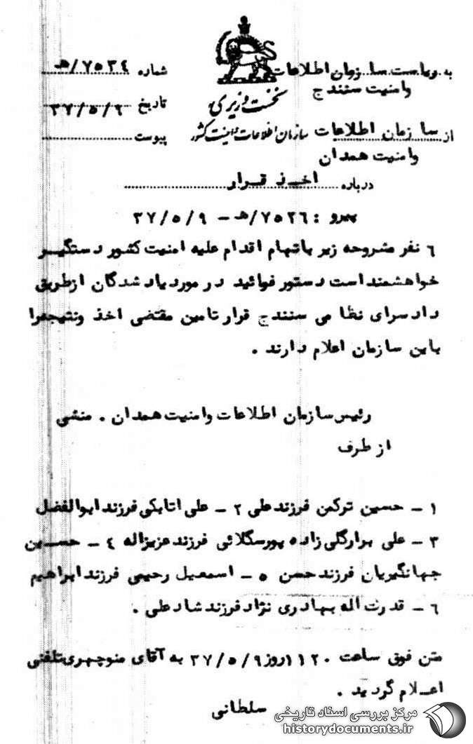6 نفر مشروحه زیر باتهام اقدام علیه امنیت کشور دستگیر خواهشمند است دستور فرمائید در مورد یادشدگان از طریق دادسرای نظامی سنندج قرار تأمین مقتضی اخذ و نتیجه را به این سازمان اعلام دارند.