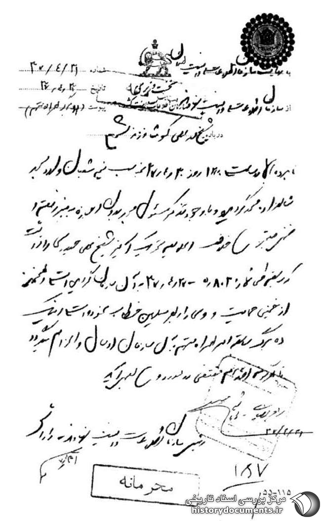 نامبرده بالا در ساعت ۱۲:۳۰ روز 21 /4 /37 به مناسبت نیمه شعبان وارد مسجد شاهزاده محمد گردیده و با وجود تذکر مسئول مسجد بدون اجازه به منبر رفته و ضمن سخنرانی خلاف، اعلامیه تحریکآمیز شیخ علی حیدری را قرائت گزارش آن طی شماره 803 /5 – 27 /4 /37 به آن سازمان ارسال گردیده است و همچنین از خمینی حمایت و وی را رهبر مسلمین خطاب نموده است اینکه ده برگ سابقه امر همراه متهم به آن سازمان ارسال و اعزام میگردد تا هر گونه اقدام مقتضی در مورد وی به عمل آید.