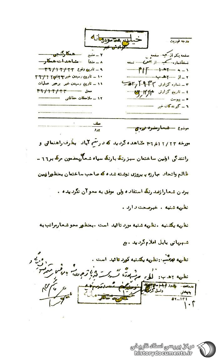 مورخه 23 /12 /36 مشاهده گردید که در مقیمآباد به طرف راهنمایی و رانندگی اولین ساختمان سبز رنگ با رنگ سیاه شعارهایی به مضمون مرگ بر 66 ظالم و اتحاد، مبارزه، پیروزی نوشته شده که صاحب ساختمان به منظور از بین بردن شعار از ضدرنگ استفاده ولی موفق به محو آن نگردیده [است].
