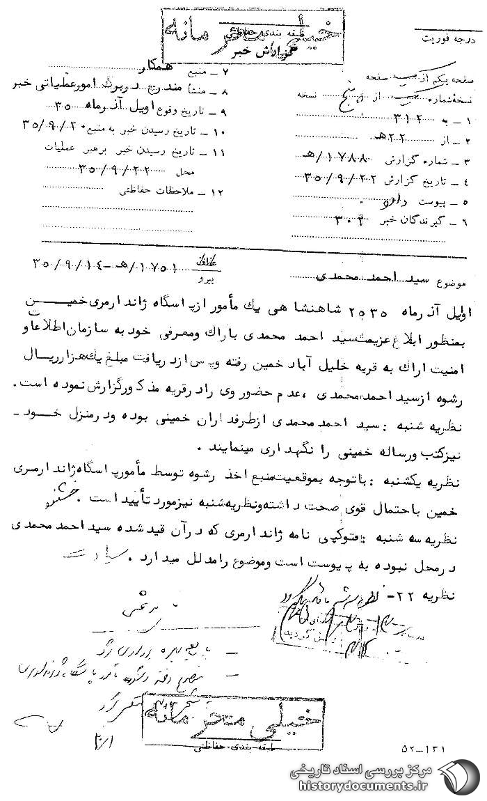 اوایل آذر ماه 2535 شاهنشاهی یک مأمور ژاندارمری خمین بمنظور ابلاغ سید احمد محمدی به اراک و معرفی خود به سازمان اطلاعات و امنیت اراک به قریه خلیل آباد خمین رفته و پس از دریافت مبلغ یک هزار ریال رشوه از سید احمد محمدی، عدم حضور وی را در قریه مذکور گزارش نموده است.