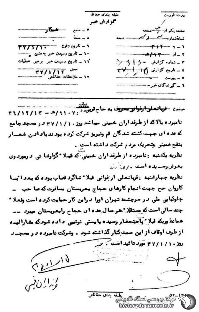 نظریه چهارشنه: قربانعلی ارغوانی قبلاً شاگرد قصاب بوده که بعداً با کاروان حج جهت انجام کارهای حجاج به عربستان مسافرت که صاحب چلوکبابی ملی در سرچشمه تهران او را در این کار حمایت کرده است و فعلاً چند سالی است که مستقلاً هر سال عدهای از حجاج را به عربستان میبرد. همان طوری که قبلاً به استحضار رسیده بایستی ترتیبی داده شود که مشارالیه از طرف اوقاف از این سمت کنار گذاشته شود. و شرکت نامبرده در مسجد روز 10 /1 /37 مورد تایید است.