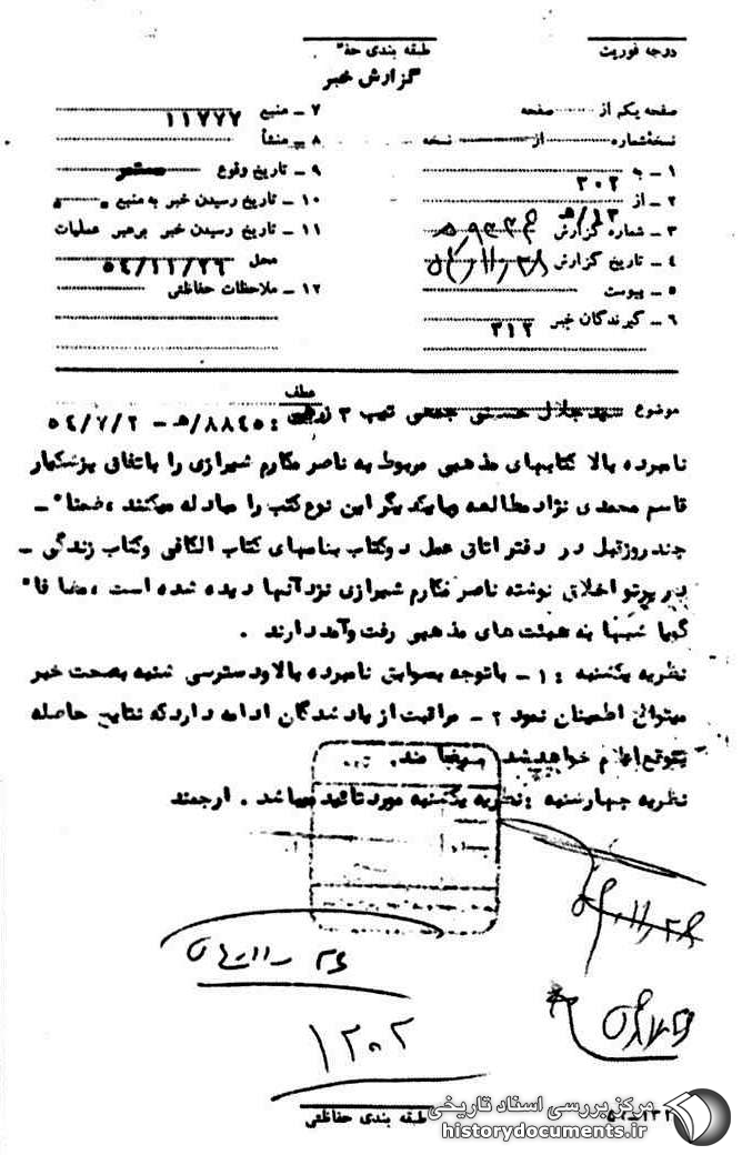 نامبرده بالا کتابهای مذهبی مربوط به ناصر مکارم شیرازی2 را به اتفاق پزشکیار قاسم محمدینژاد مطالعه و یکدیگر این نوع کتب را مبادله میکنند، ضمناً چند روز قبل در دفتر اتاق عمل دو کتاب بنامهای کتاب الکافی و کتاب زندگی در پرتو اخلاق نوشته ناصر مکارم شیرازی نزد آنها دیده شده است، مضافاً گویا شبها به هیأتهای مذهبی رفت و آمد دارند.