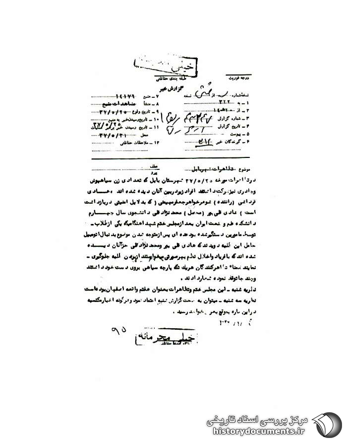 در تظاهرات مورخه 25 /5 /37 شهرستان بابل که تعدادی زن سیاهپوش و چادری نیز شرکت داشتند افراد زیر در بین آنان دیده شدهاند، هادی قرداشی (راننده) شوهرخواهر جعفر مهیمنی (که به دلایل امنیتی در بازداشت است) هادی قلیپور (محصّل) محمد نژاد قلی دانشجوی سال چهارم دانشکده علم و صنعت ایران بعد از مجلس ختم شهدا هنگامیکه یکی از طلّاب توسط مأمورین دستگیر شده بود عدهای پس از متوجه شدن موضوع به دنبال اتومبیل حامل این طلبه دویدند که هادی قلیپور و محمد نژادقلی جز آنان دیده شدهاند که با فریاد و اخلال نظم به هر صورتی میخواستند از بردن طلبه جلوگیری نمایند. ضمناً تظاهرکنندگان هریک تکه پارچه سیاهی به روی دست خود داشتند و چند جا توقف نموده شعار دادند.
