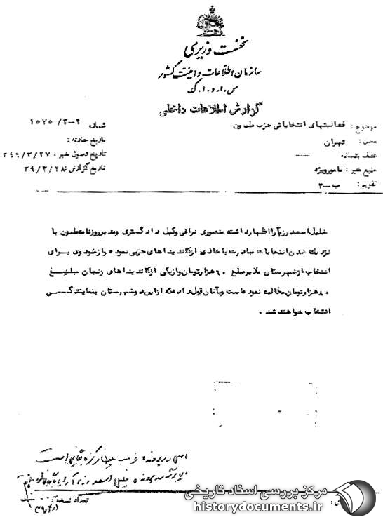 اصل در پرونده حزب ملیون مرکز بایگانى است این برگ در پرونده خلیل اسعد رزمآرا بایگانى شود.