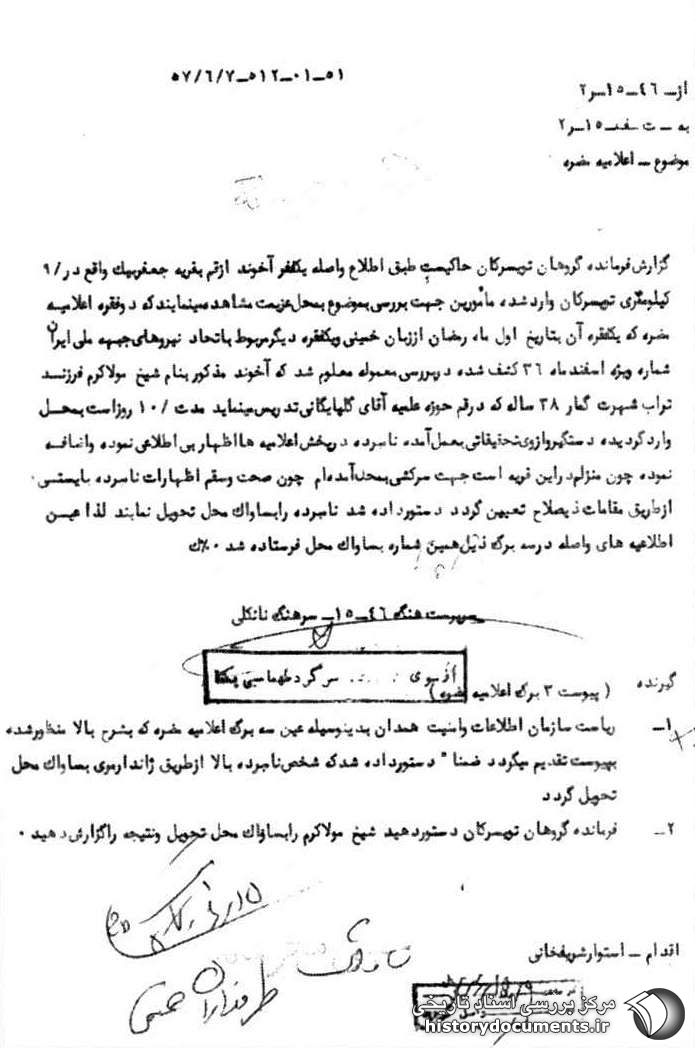 ۲- فرمانده گروهان تویسرکان دستور دهید شیخ مولا کرم را به ساواک محل تحویل و نتیجه را گزارش دهید.
