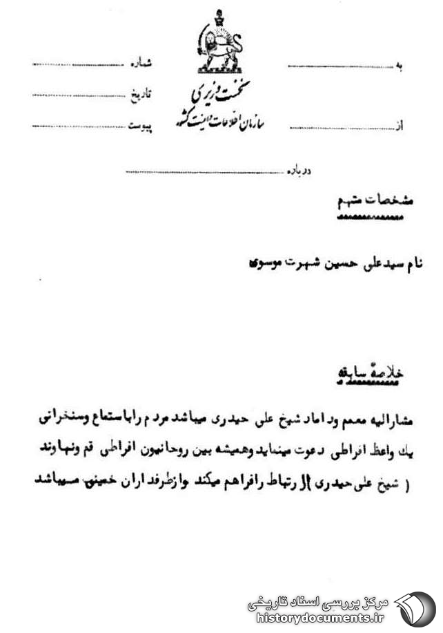 مشارالیه معمم و داماد شیخ علی حیدری میباشد مردم را به استماع و سخنرانی یک واعظ افراطی دعوت مینماید و همیشه بین روحانیون افراطی قم و نهاوند (شیخ علی حیدری) ارتباط را فراهم میکند و از طرفداران خمینی میباشد.
