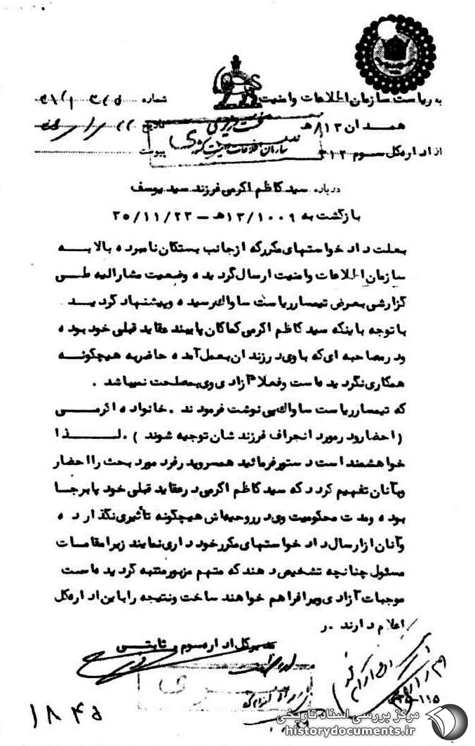 که تیمسار ریاست ساواک پی نوشت فرمودند. خانواده اکرمی (احضار و در مورد انحراف فرزندشان توجیه شوند). لذا خواهشمند است دستور فرمائید همسر و پدر فرد مورد بحث را احضار و به آنان تفهیم گردد که سید کاظم اکرمی در عقاید قبلی خود پابرجا بوده و مدت محکومیت وی در روحیهاش هیچگونه تاثیر نگذارده و آنان از ارسال داد خواستهای مکرر خوداری نمایند زیرا مقامات مسئول چنانچه تشخیص دهند که متهم مزبور متنبه گردیده است موجبات آزادی وی را فراهم خواهند ساخت و نتیجه را به این اداره کل اعلام دارند.