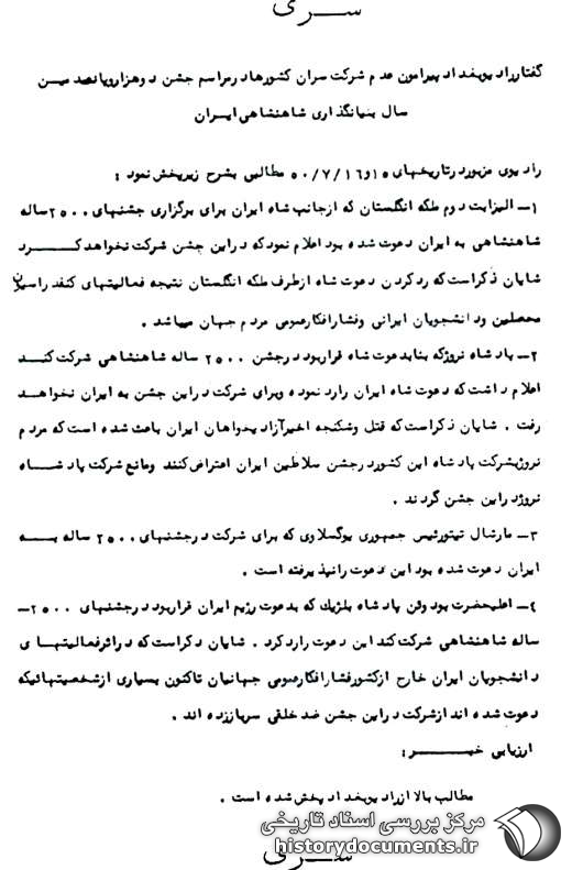 3- مارشال تیتو رئیس جمهوری یوگوسلاوی که برای شرکت در جشنهای 2500 ساله به ایران دعوت شده بود این دعوت را نپذیرفته است.