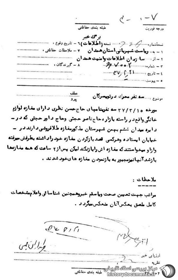 مورخه 15 /3 /57 سه نفر به نام حسن نظری دارای مغازه لوازم خانگی واقع در راسته بازار، حاج ناصر حجتی و حاج داور حجتی که در دایره میدان ششم بهمن شهرستان مذکور مغازه طلافروشی دارند در خیابان ایستاده و هر کسی قصد باز کردن مغازه خود را داشته به طرفش میرفته و از او میخواستند مغازهاش را باز نکند لیکن پس از دو ساعت که همه مغازهها باز شد آنها نیز مجبور به باز نمودن مغازههای خود شدند.