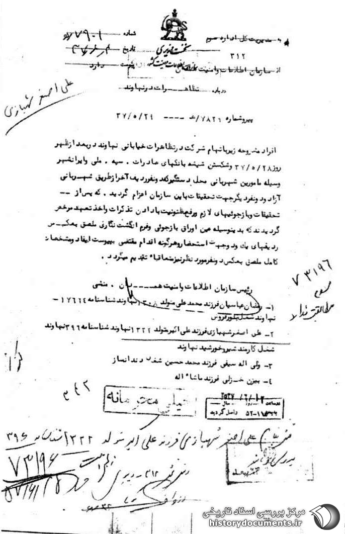 افراد مشروحه زیر به اتهام شرکت در تظاهرات خیابانی نهاوند در بعدازظهر روز 28 /5 /37 و شکستن شیشههای بانکهای صادرات، سپه، ملی و ایرانشهر وسیله مأمورین شهربانی دستگیر که دو نفر ردیف آخر از طریق شهربانی آزاد و دو نفر دیگر جهت تحقیقات به این سازمان اعزام گردید. که پس از تحقیقات و بازجوییهای لازم و رفع مظنونیت با دادن تذکرات و اخذ تعهد مرخص گردیدند که بدین وسیله اوراق بازجوئی و فرم انگشت نگاری ملصق به عکس ردیفهای یک و دو جهت استحضار و هر گونه اقدام مقتضی به پیوست ایفاد و مشخصات کامل ملصق به عکس دو نفر مورد نظر نیز متعاقباً تقدیم میگردد.