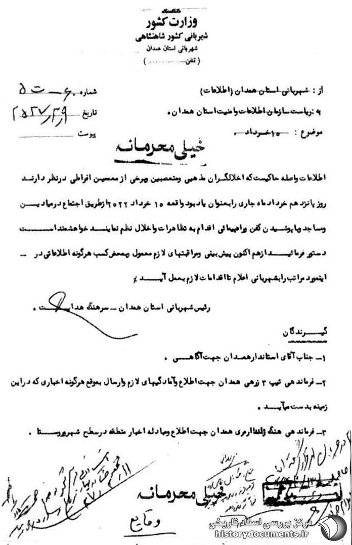 اطلاعات واصله حاکیست که اخلالگران مذهبی و متعصبین و برخی از معممین افراطی در نظر دارند روز پانزدهم خرداد ماه جاری را به عنوان یادبود واقعه ۱۵ خرداد ۲5۲۲ از طریق اجتماع در میادین و مساجد و با پوشیدن کفن و راهپیمایی اقدام به تظاهرات و اخلال نظم نمایند خواهشمند است دستور فرمائید از هم اکنون پیشبینی مراقبتهای لازم معمول و به محض کسب هر گونه اطلاعاتی در این مورد مراتب به شهربانی اعلام تا اقدامات لازم به عمل آید.