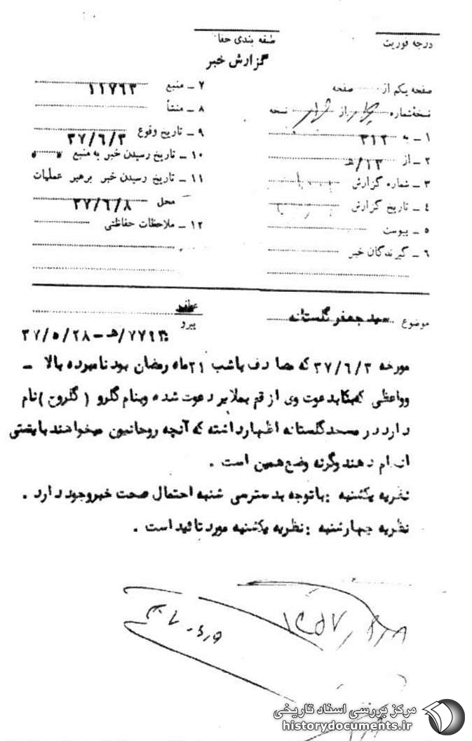 مورخه 3 /6 /37 که مصادف با شب ۲۱ ماه رمضان بود نامبرده بالا و واعظی که بنا به دعوت وی از قم به ملایر دعوت شده و به نام گلرو (گلروح) نام دارد در مسجد گلستانه اظهار داشته که آنچه روحانیون میخواهند بایستی انجام دهند وگرنه وضع همین است.