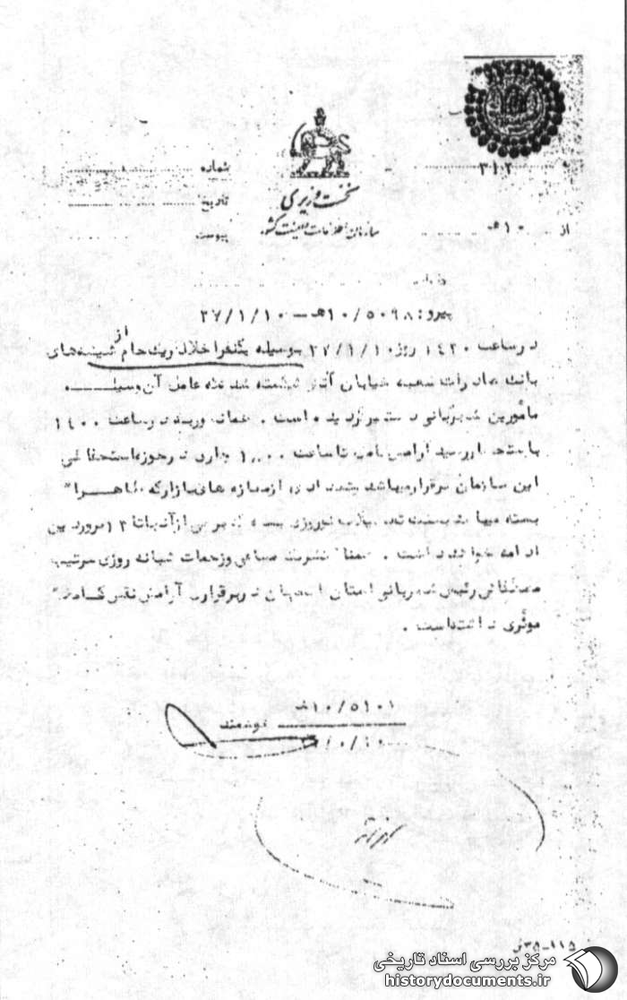 همان طوری که در ساعت ۱۴۰۰ به استحضار رسید آرامش کامل تا ساعت ۱۸۰۰ جاری در حوزه استحفاظی این سازمان برقرار میباشد و تعدادی از مغازههای بازار که ظاهراً بسته میباشد به علت تعطیلات نوروزی بوده که برخی از آنها تا ۱۳ فروردین ادامه خواهد داشت.۲