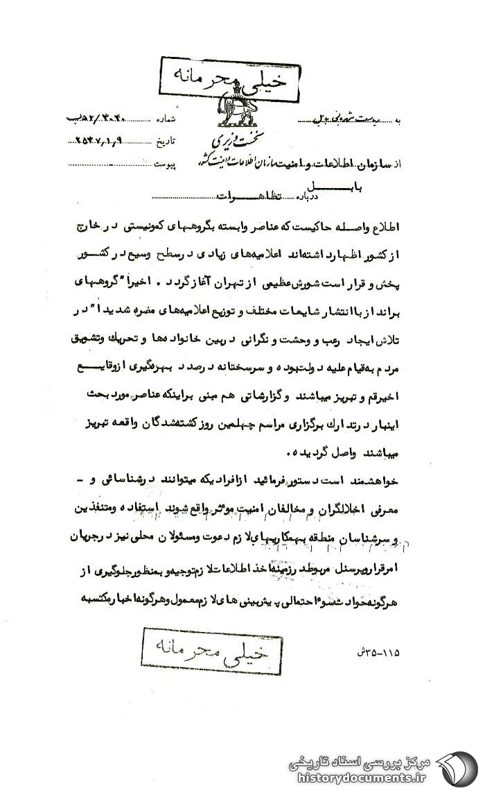 اطلاع واصله حاکی است که عناصر وابسته به گروههای کمونیستی در خارج از کشور اظهار داشتهاند اعلامیههای زیادی در سطح وسیع در کشور پخش و قرار است شورش عظیمی از تهران آغاز گردد. اخیراً گروههای برانداز با انتشار شایعات مختلف و توزیع اعلامیههای مضرّه شدیداً در تلاش ایجاد رعب و وحشت و نگرانی در بین خانوادهها و تحریک و تشویق مردم به قیام علیه دولت بوده و سرسختانه درصدد بهرهگیری از وقایع اخیر قم و تبریز میباشند و گزارشاتی هم مبنی بر اینکه عناصر مورد بحث این بار در تدارک برگزاری مراسم چهلّمین روز کشتهشدگان واقعه تبریز میباشند واصل گردیده [است].