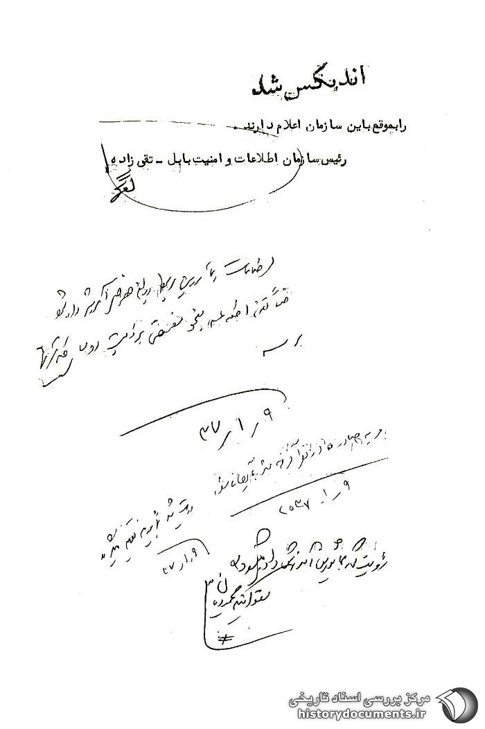 خواهشمند است دستور فرمایید از افرادی که میتوانند در شناسایی و معرفی اخلالگران و مخالفان امنیت مؤثر واقع شوند استفاده و متنفّذین و سرشناسان منطقه به همکاریهای لازم دعوت و مسئولان محلّی نیز در جریان امر قرار و پرسنل مربوط در زمینهی اخذ اطلاعات لازم توجیه و به منظور جلوگیری از هرگونه حوادث سوء احتمالی پیشبینیهای لازم معمول و هرگونه اخبار مکتسبه را به موقع به این سازمان اعلام دارند.