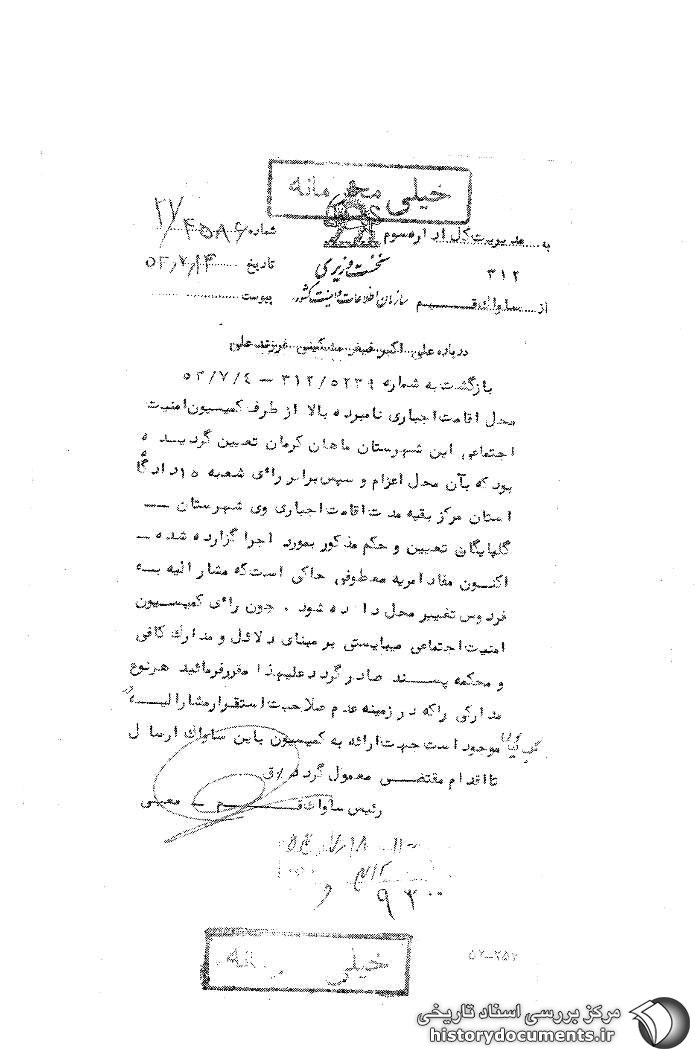 محل اقامت اجباری نامبرده بالا از طرف کمیسیون امنیت اجتماعی این
