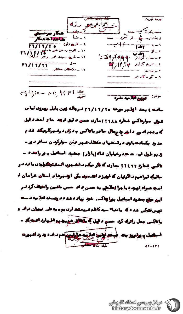 ساعت 4 بعداز ظهر مورخه 25 /12 /36 در چاله زمین بابل روبهروی لباسشویی سوار تاکسی شماره 22988 ساری حسن دقیق1 فرزند حاج احمد دقیق که پنجم ادبی دارد و در حال حاضر با تاکسی پدرش در شهر کار میکند شدم حدود یک ساعت با وی در قسمتهای مختلف شهر ضمن سوار کردن مسافر دور زدیم طول این مدت در خیابان شاه (بازار) جمشید اسماعیلپور راننده تاکسی شماره 22497 ساری که فکر میکنم دانشجوی انستیتو تکنولوژی باشد در حالی که ابراهیم داگوئیان2 که او نیز دانشجوی یکی از شهرهای استان خراسان است همراه او بوده با چراغ علامتی به حسن داد حسن ماشین را متوقف کرد در این موقع جمشید اسماعیلپور از تاکسی خود پیاده شده دو نسخه اعلامیه دستنویس فتوکپی شده که به امضای سیدکاظم شریعتمداری بود به علی نبویان داد و با تاکسی محل را ترک کرد حسن دقیق که به اتفاق هم بودیم اظهار داشت که اسماعیلپور امروز چند نسخه از این اعلامیهها را به من هم داده و در داشبورد3 تاکسی را باز کرد و به من نشان داد.4