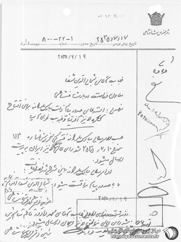 نامبرده تحت تأثیر اقدامات بشردوستانه شاهنشاه آریامهر، آرزو دارد تمثال مبارک شهریار ایران را که مزین به توشیح ملوکانه باشد به عنوان بهترین ارمغان از کشور ما با خود داشته باشد.