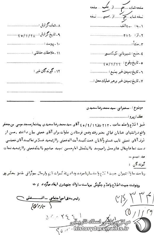 طبق اطلاع واصله ساعت 2130 روز 19 /9 /45 آقای سیدمحمدرضا سعیدی، پیشنماز مسجد موسی بن جعفر واقع در انتهای خیابان غیاثی به منبر رفته و ضمن فرستادن صلوات برای آقای خمینی بیان داشته: من از طرف آقای خمینی نایب هستم و آقایان همت کنید، آیتالله خمینی را از تبعید خلاص نمایید. آقای خمینی دست شماها و بقالهای محل را میبوسد. یا اینکه مثل امام حسین شهید میشویم، یا اینکه خمینی را از تبعید نجات میدهیم.