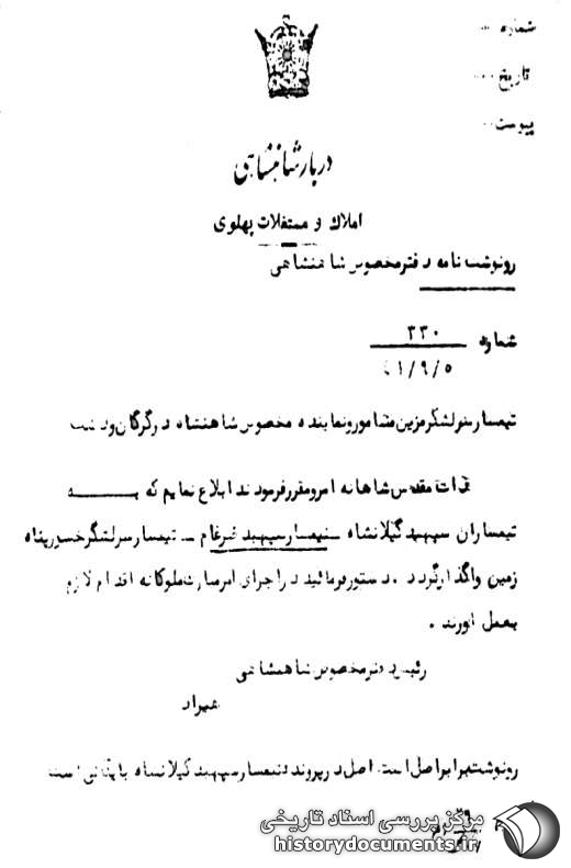 ذات مقدس شاهانه امر و مقرر فرمودند: ابلاغ نمایم که به تیمسار سپهبد گیلانشاه ـ تیمسار سپهبد ضرغام ـ تیمسار سرلشگر خسروپناه زمین واگذار گردد. دستور فرمایید در اجرای امر مبارک ملوکانه اقدام لازم به عمل آورند.