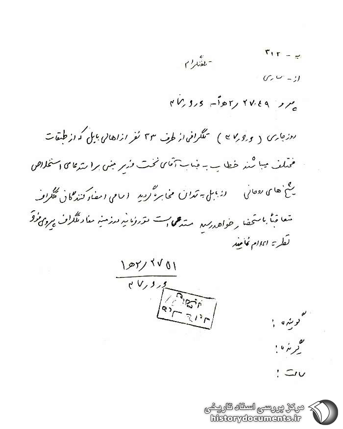 روز جاری (6 /6 /37) تلگرافی1 از طرف 33 نفر از اهالی بابل که از طبقات مختلف میباشند خطاب به جناب آقای نخست وزیر مبنی بر استدعای استخلاص شیخ هادی روحانی از بابل به تهران مخابره گردید. اسامی امضاءکنندگان تلگراف متعاقباً به استحضار خواهد رسید. مستدعی است مقرر فرمایند در زمینه مفاد تلگراف پیروی فوق نظریه اعلام نمایند.