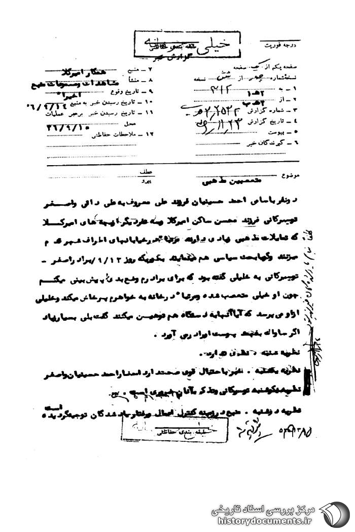 دو نفر به اسامی احمد حسینیان فرزند علی معروف به علی دائی و اصغر تویسرکانی فرزند محسن ساکن امیرکلا و سه نفر دیگر از بچههای امیرکلا که تمایلات مذهبی زیادی دارند مرتباً در خیابانهای اطراف شهر قدم میزنند و گویا بحث سیاسی هم مینمایند بطوریکه روز 13 /9 /36 برادر اصغر تویسرکانی به خلیلی گفته بود که برای برادرم وضع بدی پیشبینی میکنم چون او خیلی متعصّب شده و مرتباً در خانه به خواهرم پرخاش میکند و خلیلی از او میپرسد که آیا آنها به دستگاه هم توهین میکنند گفت بلی بسیار زیاد اگر ساواک بفهمد پوست او را درمیآورد.1