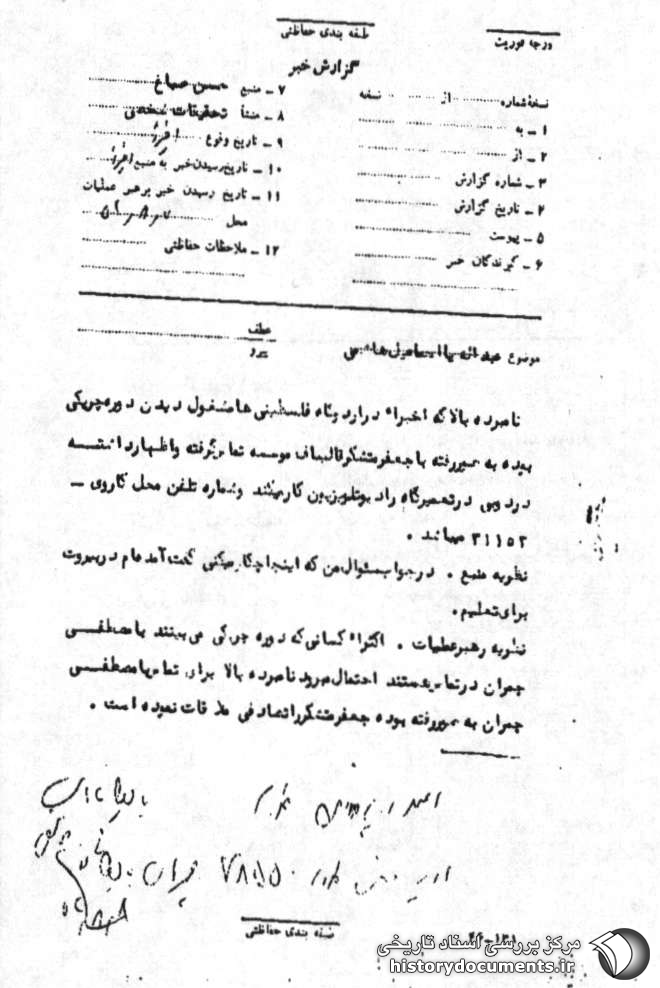 نامبرده بالا که اخیراً در اردوگاه فلسطینیها مشغول دیدن دوره چریکی بوده به صور رفته با جعفر متشکر قالیباف موسسه تماس گرفته و اظهار داشته در دوبی در تعمیرگاه رادیو تلویزیون کار میکند و شماره تلفن محل کار وی ۳۱۱۵۳ میباشد.