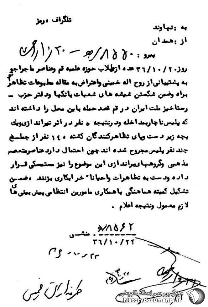 روز 20 /10 /36 عدهای از طلاب حوزه علمیه قم و عناصر ماجراجو به پشتیبانی از روحاله خمینی و اعتراض1 به مقاله مطبوعات تظاهرات به راه و ضمن شکستن شیشههای شعبات بانکها و دفتر حزب رستاخیز ملت ایران در قم قصد حمله به این محل را داشتهاند که پلیس ناچار به مداخله و در نتیجه ۵ نفر در اثر تیراندازی و یک بچه زیر دست و پای تظاهر کنندگان کشته، 14 نفر از جمله چند نفر پلیس مجروح شدهاند چون احتمال دارد عناصر متعصب مذهبی و گروههای براندازی این موضوع را نیز مستمسکی قرار داده و دست به تظاهرات و احیاناً خرابکاری بزنند، ضمن تشکیل کمیتههای هماهنگی با همکاری مأمورین انتظامی پیشبینیهای لازم معمول و نتیجه اعلام.
