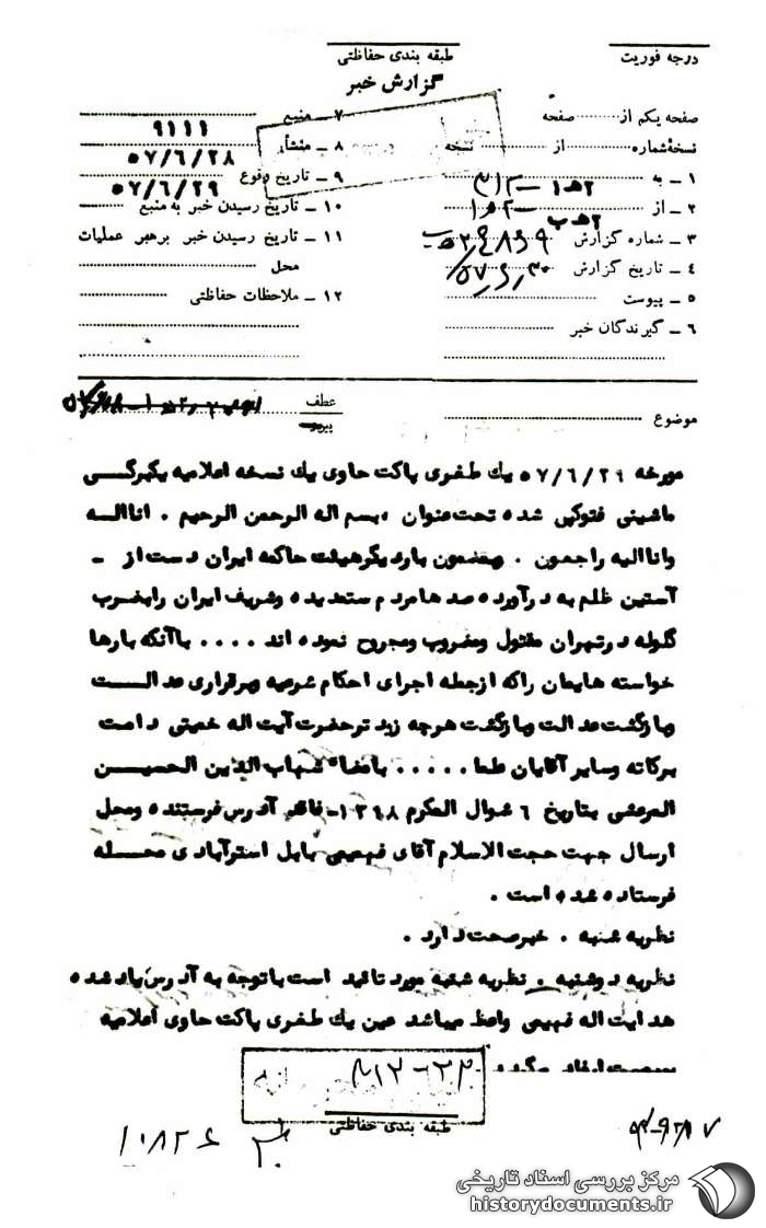 انالله و انّاالیه راجعون و به مضمون: بار دیگر هیئت حاکمه ایران دست از آستین ظلم به در آورده، صدها مردم ستمدیده و شریف ایران را به ضرب گلوله در تهران مقتول و مضروب و مجروح نمودهاند.... با آن که بارها خواستههایمان را که از جمله اجرای احکام شرعیه و برقراری عدالت و بازگشت عدالت و بازگشت هر چه زودتر حضرت آیتالله خمینی دامت برکاته و سایر آقایان علما.... به امضاء شهابالدین الحسین المرعشی به تاریخ 6 شوال المکرم 1398 – فاقد آدرس فرستنده و محل ارسال جهت حجتالاسلام آقای فهیمی بابل استرآبادی محله فرستاده شده است.