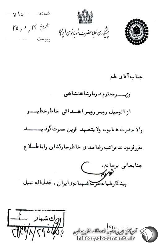 از اتومبیل رویس رویس اهدایی خاطر خطیر والاحضرت همایون ولایتعهد قرین مسرت گردید مقرر فرمودند مراتب رضامندی خاطر مبارکشان را به اطلاع جنابعالی برسانم.
