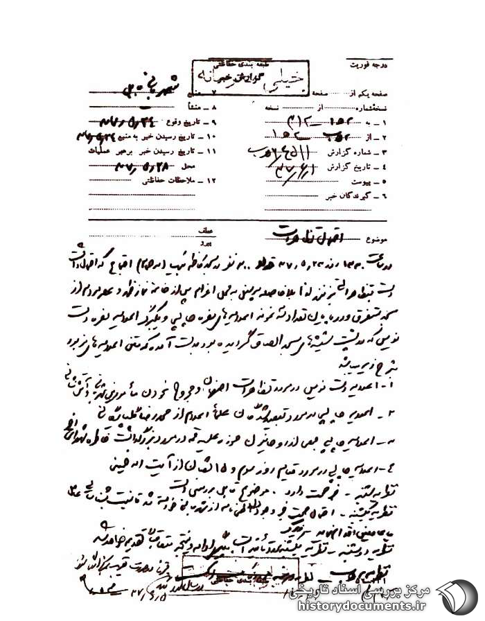 1ـ اعلامیه دستنویس در مورد تظاهرات اصفهان و مجروح نمودن مأمورین شهربانی و آتشنشانی؛