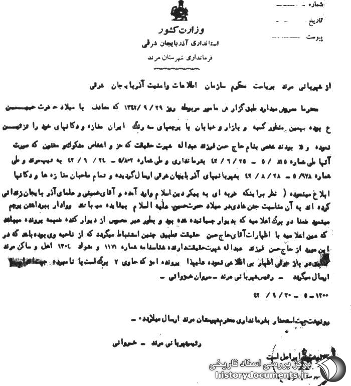 محترماً معروض میدارد: طبق گزارش مامور مربوطه روز 29 /9 /1342 که مصادف با میلاد حضرت حسین (ع) بوده، به همین منظور کسبه و بازار و خیابان، با پرچمهای سه رنگ ایران مغازه و دکانهای خود را تزئین نموده بودند، شخصی به نام حاج حسن فرزند عبداله شهرت حقیقت که جزو اشخاص مشکوک و مظنون که صورت آنها طی شماره 815 /5- 25 /9 /42 به فرمانداری و طی شماره 802 /5- 24 /9 /42 به تیپ مرند و طی شماره 978 /5- 28 /8 /42 به شهربانیهای آذربایجان شرقی ارسال گردیده، به تمام صاحبان مغازهها و دکانها ابلاغ مینموده: نظر بر این که ضربهای به پیکر دین اسلام وارد آمده و آقای خمینی و علمای آذربایجان [را] زندانی کردهاند، به آن مناسبت جشن شادی در میلاد حضرت حسین علیه السلام بیفایده میباشد و وادار به برداشتن پرچم مینمود. ضمناً دو برگ اعلامیه که به دیوار چسبانیده شده بود و به طور غیر محسوس از دیوار کنده، ضمیمه پرونده میباشد که عین اعلامیه با اظهارات آقای حاج حسن حقیقت تطبیق، چنین استنباط میگردد که از ناحیه وی بوده باشد که در این مورد از حاج حسن فرزند عبداله شهرت حقیقت دارنده شناسنامه شماره 1171 و متولد 1304 اهل و ساکن مرند تحقیق، در بازجوئی اظهار بیاطلاعی نموده، علیهذا پرونده امر که حاوی 7 برگ است با نامبرده جهت اقدام مقتضی ارسال میگردد.