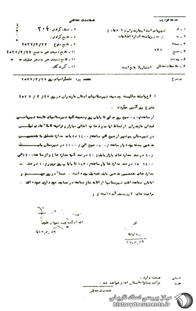 از ساعت 8 صبح روز مذکور وضعیت کلیه شهرستانهای تابعه، شهربانی استان مازندران از لحاظ ایاب و ذهاب اهالی، بازار و ترافیک کاملاً عادّی، لیکن در شهرستان بهشهر از صبح الی ساعت 1400 ده باب مغازه متعلّق به متعصّبین مذهبی بسته بوده و از ساعت 8 صبح الی 12 در شهرستان بابل 60 درصد مغازههای بازار بابل (20 درصد کلیه مغازهها) و از ساعت 12 الی 14، 15 درصد مغازهها و از ساعت 1830 تا پایان روز مزبور 10درصد مغازههای متعصبین مذهبی بابل تعطیل بوده است. ضمناً در روز مزبور امامان جماعت اغلب شهرستانها از اقامه نماز جماعت در مساجد خودداری نمودهاند. مراقبتهای لازم به عمل آمده است.