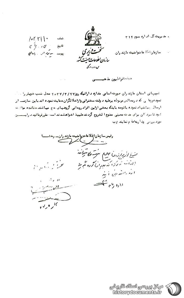 شهربانی استان مازندران صورت اسامی مغازهدارانی که روز 27 /3 /2537 محل کسب خویش را تعطیل نموده و عاملینی که در مجالس مربوطه برعلیه دولت سخنرانی و از اخلالگران حمایت نمودهاند به این سازمان ارسال پیشنهاد نموده باتوجه به اینکه بعضی از این افراد روحانی گروههای حج میباشند چنانچه موافقت شود نامبردگان برای مدت معینی ممنوعالخروج1 گردند علیهذا خواهشمنداست مقرر فرمائید در این مورد بررسی و نظریه اعلام نمایند.
