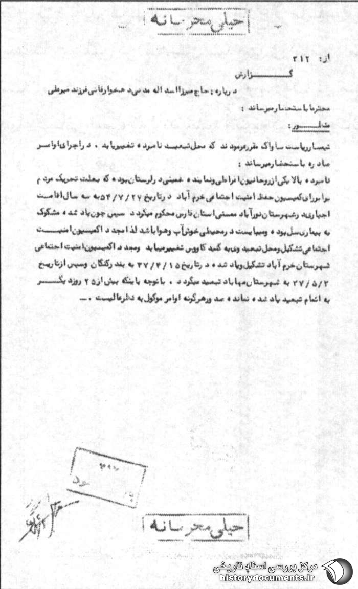 نامبرده بالا یکی از روحانیون افراطی و نماینده خمینی در لرستان بوده که به علت تحریک مردم برابر رأی کمیسیون حفظ امنیت اجتماعی خرم آباد در تاریخ 27/۷ /54 به سه سال اقامت اجباری در شهرستان نورآباد ممسنی استان فارس محکوم میگردد سپس چون یاد شده مشکوک به بیماری سل بوده و میبایست در محیطی خوش آب و هوا باشد لذا مجدد کمیسیون امنیت اجتماعی تشکیل و محل تبعید وی به گنبدکاووس تغییر مییابد و مجدد کمیسیون امنیت اجتماعی شهرستان خرمآباد تشکیل و یاد شده در تاریخ 15/۴ /37 به بندر کنگان و سپس از تاریخ 3/۵ /37 به شهرستان مهاباد تبعید میگردد. با توجه به اینکه بیش از ۲۵ روز دیگر به اتمام تبعید یاد شده نمانده صدور هرگونه اوامر موکول به نظر عالیست.