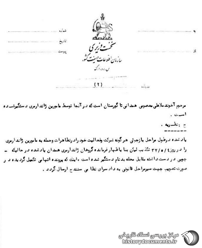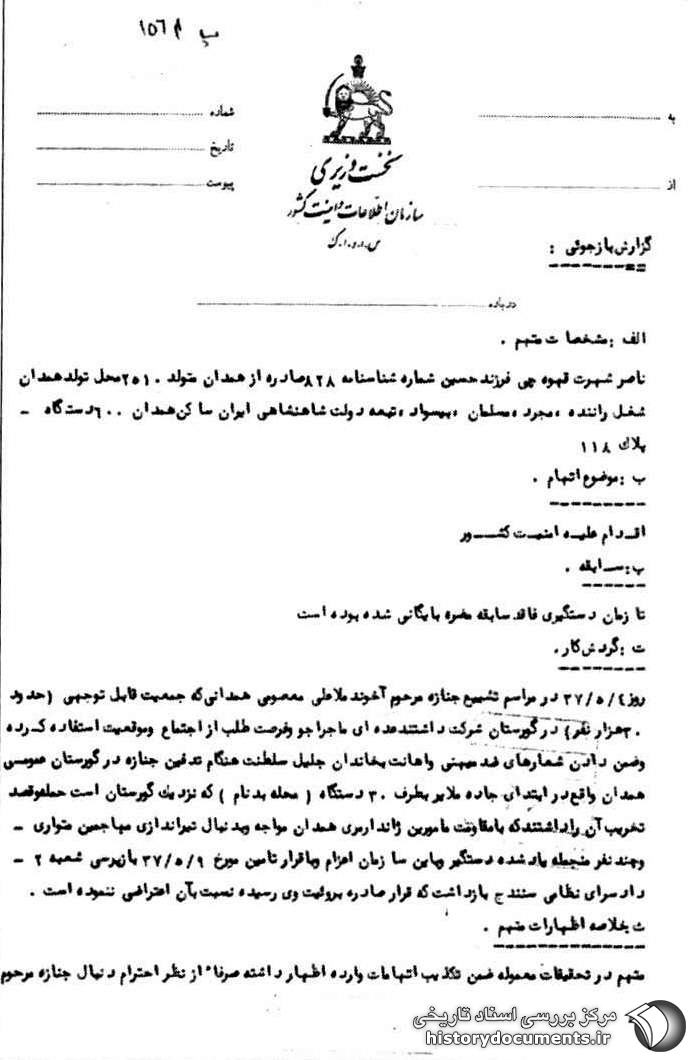 روز 4 /5 /37 در مراسم تشییع جنازه مرحوم آخوند ملاعلی معصومی همدانی که جمعیت قابل توجهی (حدود ۳۰ هزار نفر) در گورستان شرکت داشتند عدهای ماجراجو و فرصت طلب از اجتماع و موقعیت استفاده کرده و ضمن دادن شعارهای ضدمیهنی و اهانت به خاندان جلیل سلطنت هنگام تدفین جنازه در گورستان عمومی همدان واقع در ابتدای جاده ملایر به طرف ۳۰ دستگاه (محله بدنام) که نزدیک گورستان است حمله و قصد تخریب آن را داشتند که با مقاومت مأمورین ژاندارمری همدان مواجه و به دنبال تیراندازی مهاجمین متواری- و چند نفر منجمله یاد شده دستگیر و به این سازمان اعزام و با قرار تأمین مورخ 9 /5 /37 بازپرسی شعبه ۲- دادسرای نظامی سنندج بازداشت که قرار صادره به رویت وی رسیده نسبت به آن اعتراضی ننموده است.