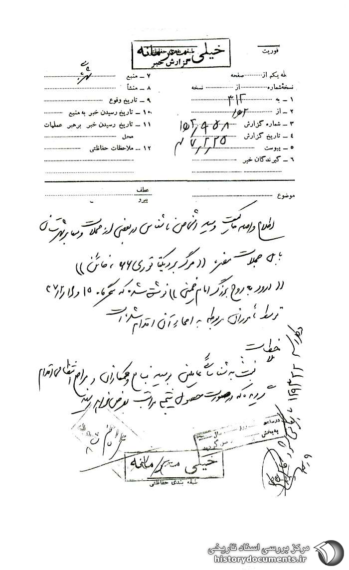 اطلاع واصله حاکیست وسیله اشخاص ناشناسی در بعضی از محلّات و معابر شهرستان بابل جملات مضرّه «مرگ بر دیکتاتوری 66، خائن» «درود به روح بزرگ امام خمینی» نوشته شده که سحرگاه 15 و 16 / 2/ 37 توسط مأموران مربوطه به امحاء آن اقدام شده است.