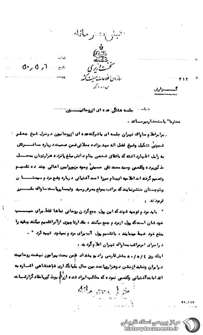 برابر اعلام ساواک تهران جلسهای با شرکت عدهای از روحانیون در منزل شیخ جعفر شجونی1 تشکیل و شیخ فضلاله مهدیزاده محلاتی ضمن صحبت درباره مسافرتش به زابل اظهار داشته که به اتفاق شخصی به نام دانش مبلغ پانزده هزار تومان بمحل مذکور برده و کفعمی و سید محمدتقی حسینی2 وجوه مزبور را بین اهالی چند ده تقسیم و تصمیم گرفتهاند اعلامیهای به نام میرزا احمد آشتیانی درباره وضع مردم سیستان و بلوچستان منتشر نمایند که مراتب به موقع به عرض رسید و تیمسار ریاست ساواک مقرر فرمودند: