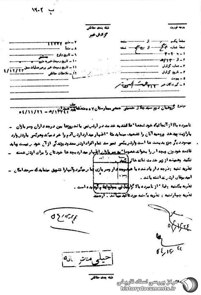 نامبرده بالا از آنجایی که خود شخصاً علاقمند به خدمت در ارتش نمیباشد روزها بین درجهداران و سربازان پارازیت میدهد و روحیه آنان را تضعیف مینماید مثلاً اظهار میدارد ارتش آدم را خرد میکند و هر کسی به ارتش وارد میشود دیگر جزو بدبختها است و ارتش به کسی نمیرسد تمام افراد ارتش محدود و زندگی از آن خودش نیست و باید فاتحه خود و زن و بچهاش را بخواند خصوصاً به سربازان اظهار میدارد بچهها خودتان را برای ارتش خسته نکنید و همیشه از زیر خدمت شانه خالی کنید.