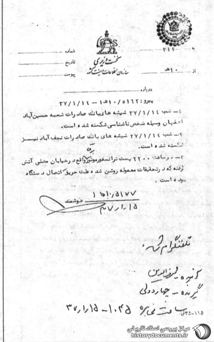 ۲- شب 14 /1 /37 شیشههای بانک صادرات نجفآباد نیز شکسته شده است.