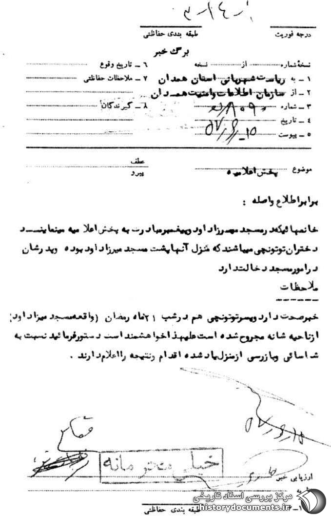 خبر صحت دارد و پسر توتونچی هم در شب ۲۱ ماه رمضان (واقعه مسجد میرزا داود) از ناحیه شانه مجروح شده است علیهذا خواهشمند است دستور فرمائید نسبت به شناسایی و بازرسی از منزل یاد شده اقدام و نتیجه را اعلام دارند.
