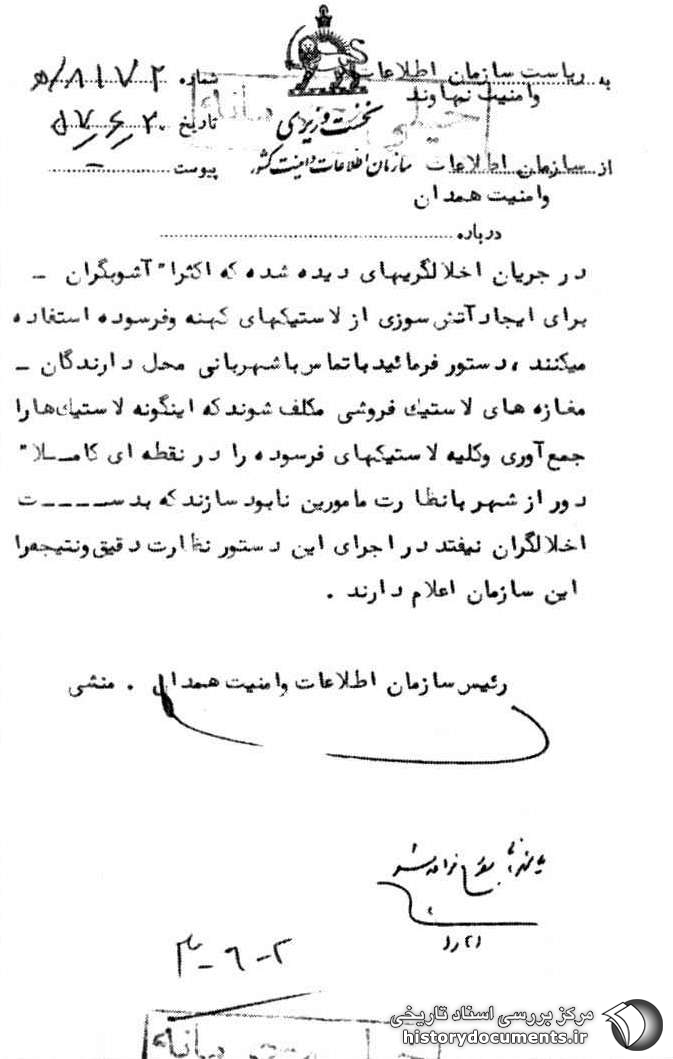 در جریان اخلالگریهای دیده شده که اکثراً آشوب گران برای ایجاد آتش سوزی از لاستیکهای کهنه و فرسود استفاده میکنند، دستور فرمائید با تماس با شهربانی محل دارندگان- مغازههای لاستیک فروشی مکلف شوند که اینگونه لاستیکها را جمعآوری و کلیه لاستیکهای فرسوده را در نقطهای کاملاً دور از شهر با نظارت مأمورین نابود سازند که بدست اخلالگران نیفتد در اجرای این دستور نظارت دقیق و نتیجه را به این سازمان اعلام دارند.
