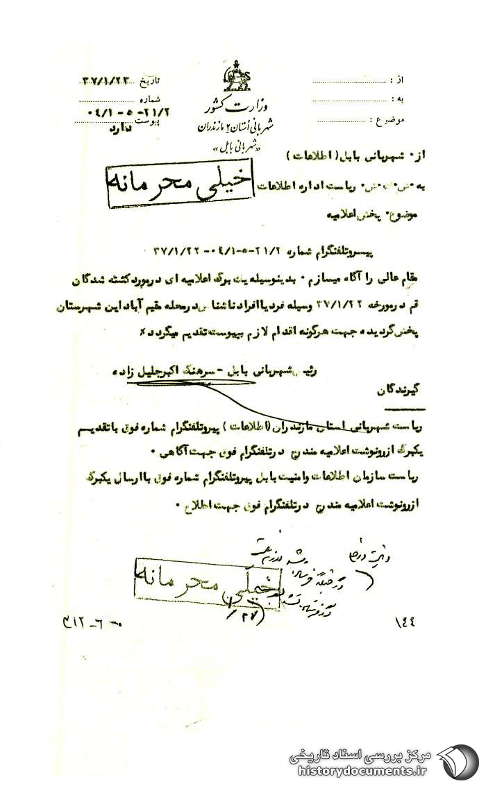 ریاست سازمان اطلاعات و امنیت بابل پیرو تلفنگرام شماره فوق با ارسال یک برگ از رونوشت اعلامیه مندرج در تلفنگرام فوق جهت اطلاع.