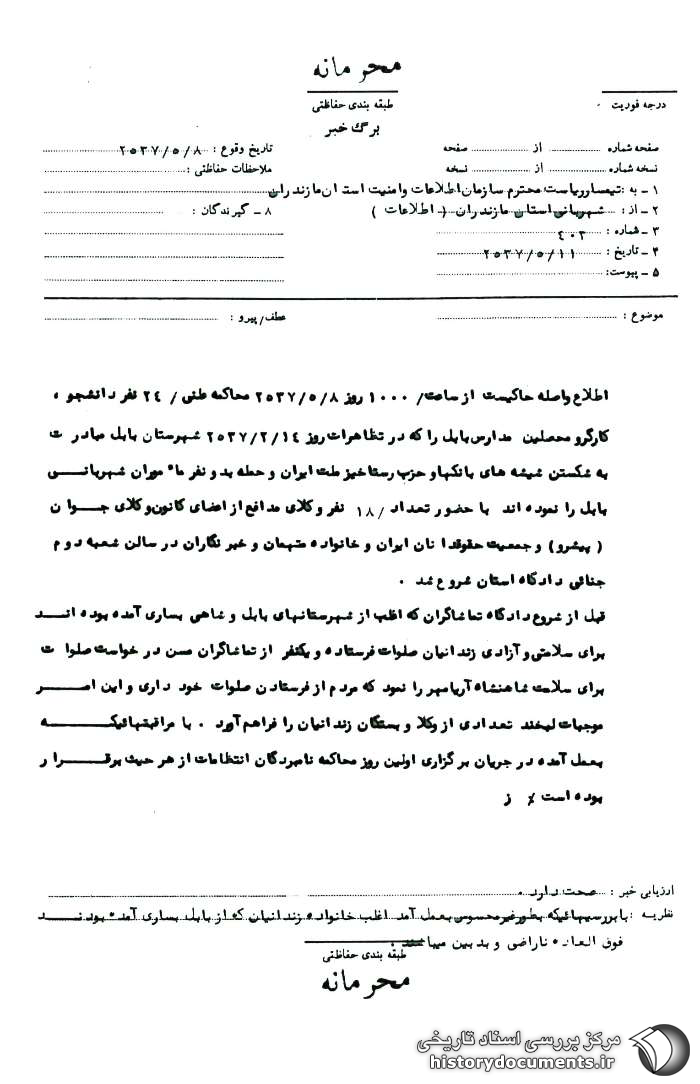 اطلاع واصله حاکیست از ساعت 1000 روز 8 /5 /2537 محاکمهی علنی 24 نفر دانشجو، کارگر و محصّلین مدارس بابل را که در تظاهرات روز 14 /2 /2537 شهرستان بابل مبادرت به شکستن شیشههای بانکها و حزب رستاخیز ملّت ایران و حمله به دو نفر مأموران شهربانی بابل را نمودهاند با حضور تعداد 18 نفر وکلای مدافع از اعضای کانون وکلای جوان (پیشرو) و جمعیت حقوقدانان ایران و خانواده متهمان و خبرنگاران در سالن شعبه دوم جنائی دادگاه استان شروع شد.