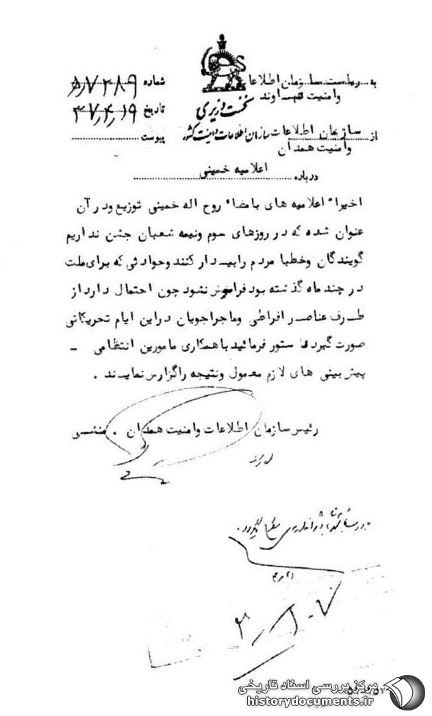 اخیراً اعلامیههای به امضا روحالله خمینی توزیع و در آن عنوان شده که در روزهای سوم و نیمه شعبان جشن نداریم گویندگان و خطبا مردم را بیدار کنند و حوادثی که برای ملت در چند ماه گذشته بود فراموش نشود چون احتمال دارد از طرف عناصر افراطی و ماجراجویان در این ایام تحریکاتی صورت گیرد دستور فرمائید با همکاری مأمورین انتظامی پیشبینیهای لازم معمول و نتیجه را گزارش نمایند.