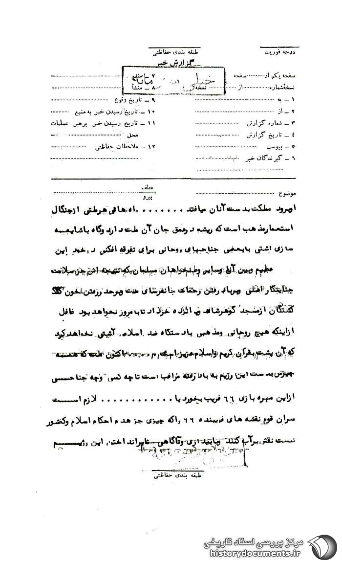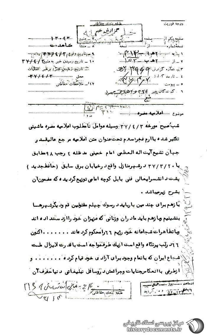 شب و صبح مورخه 3 / 4/ 37 وسیله عوامل نامطلوب اعلامیه مضرّه ماشینی تکثیر شده با آرم فجر اسلام تحت عنوان متن اعلامیه مرجع عالیقدر جهان تشیع آیتالله العظمی امام خمینی مُدّ ظله 4رجب 98 مطابق با 20 / 3 /37 در شهر منازل واقع در خیابان برق سابق (حافظ جدید) پشت دانشسرای عالی فنی بابل، کوچه امامی توزیع گردیده که مضمون آن به شرح زیر میباشد: