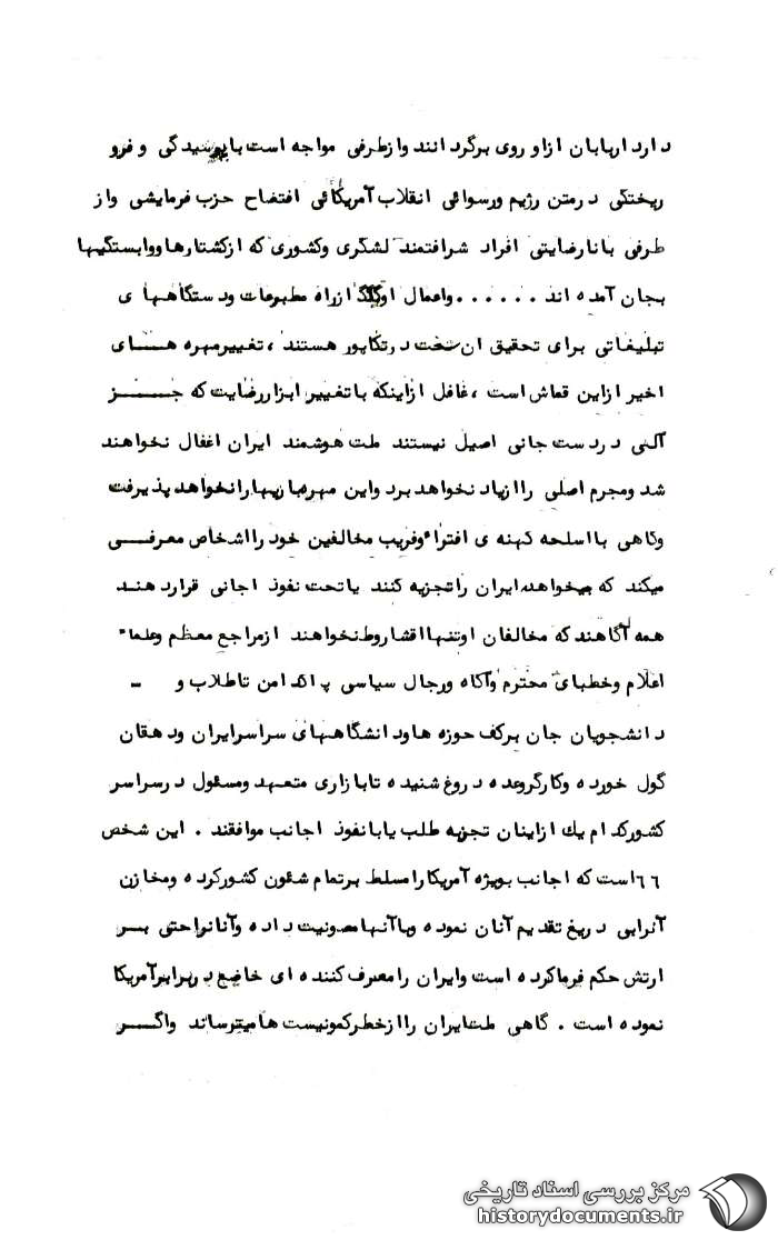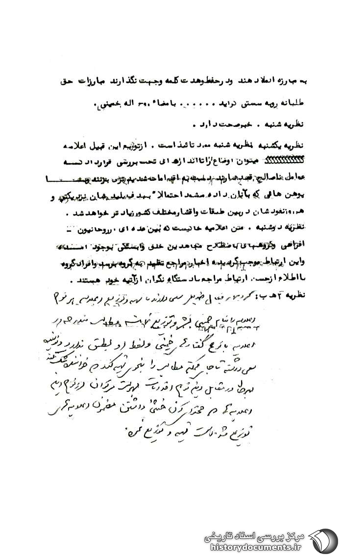 باز هم برای چندمین بار باید در سوگ چهلّم مقتولین قم و دیگر شهرها بنشینیم و باز هم باید مادران و زنانی که عزیزان خود را از دست دادهاند و با تظاهرات شجاعانه خود رژیم 66 را محکوم کردهاند.... اکنون 66 در لب پرتگاه واقع است. از یک طرف مواجه است با قدرت لایزال ملّت شجاع ایران که با تمام وجود برای آزادی خود قیام کرده....... و از طرفی با انعکاس جنایات و جرائمش در وسائل تبلیغاتی دنیا خوف آن دارد اربابان از وی روی برگردانند و از طرفی مواجه است با پوسیدگی و فروریختگی در متن رژیم و رسوائی انقلاب آمریکائی افتضاح حزب فرمایشی و از طرفی با نارضایتی افراد شرافتمند لشگری و کشوری که از کشتارها و وابستگیها به جان آمدهاند..... و عمال او از راه مطبوعات و دستگاههای تبلیغاتی برای تحقق آن سخت در تکاپو هستند، تغییر مهرههای اخیر از این قماش است، غافل از این که با تغییر ابزار رضایت که جز آلتی در دست جانی اصیل نیستند، ملّت هوشمند ایران اغفال نخواهند شد و مجرم اصلی را از یاد نخواهد برد و این مهرهبازیها را نخواهند پذیرفت و گاهی با اسلحه کهنهی افتراء و فریب مخالفین خود را اشخاصی معرفی میکند که میخواهند ایران را تجزیه کنند یا تحت نفوذ اجانب قرار دهند، همه آگاهند که مخالفان او تنها اقشار وطنخواهند از مراجع معظم و علماء اعلام و خطبای محترم و آگاه و رجال سیاسی پاکدامن تا طلّاب و دانشجویان جان بر کف حوزهها و دانشگاههای سراسر ایران و دهقان گولخورده و کارگر وعده دروغ شنیده تا بازاری متعهد و مسئول در سراسر کشور کدام یک از اینان تجزیهطلب یا با نفوذ اجانب موافقند. این شخص 66 است که اجانب به ویژه آمریکا را مسلط بر تمام شئون کشور کرده و مخازن آن را بیدریغ تقدیم آنان نموده و به آنها مصونیت داده و آنان را حتی بر ارتش حکمفرما کرده است و ایران را مصرفکنندهای خاضع در برابر آمریکا نموده است. گاهی ملّت ایران را از خطر کمونیستها میترساند و اگر او برود مملکت به دست آنان میافتد......... راه رهائی هر ملّتی از چنگال استعمار مذهب است که ریشه در عمق جان آن ملّت دارد و گاه با شایعهسازی آشتی با بعضی جناحهای روحانی برای تفرقهافکنی در خود این جناح عظیم و بین آن و سایر وطنخواهان مسلمان که نتیجهاش جز سلامت جنایتکار اصلی و بر باد رفتن زحمات جانفرسای ملّت و بر هدر رفتن خون کشتگان از مسجد گوهرشاد و پانزده خرداد تا به امروز نخواهد بود، غافل از اینکه هیچ روحانی و مذهبی با دستگاه ضداسلامی آشتی نخواهد کرد که آن پشت به قرآن کریم و اسلام عزیز است ......................... اکنون ملّت که همه چیزش به دست این رژیم به باد رفته مراقب است تا چه کسی و چه جناحی از این مهرهبازی 66 فریب بخورد یا .................... لازم است سران قوم نقشههای فریبنده 66 را که چیزی جز هدم احکام اسلام و کشور نیست نقش بر آب کنند و با بیداری و آگاهی تا برانداختن این رژیم به مبارزه ادامه دهند و در حفظ وحدت کلمه و جهت نگذارند مبارزات حقطلبانه رو به سستی گراید..... به امضاء روحالله خمینی.