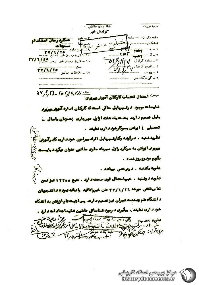 نظریه دوشنبه: خبر به احتمال قوی صحت دارد. منبع 12355 نیز ضمن تماس تلفنی مورخه 26 / 6 /37 متن خبر را تائید و اضافه نموده دانشجویان دانشگاه علم و صنعت تهران نیز تصمیم دارند پس از ثبتنام از رفتن به دانشگاه خودداری نمایند. پیگیری در مورد شناسائی عاملین شایعات ادامه دارد.